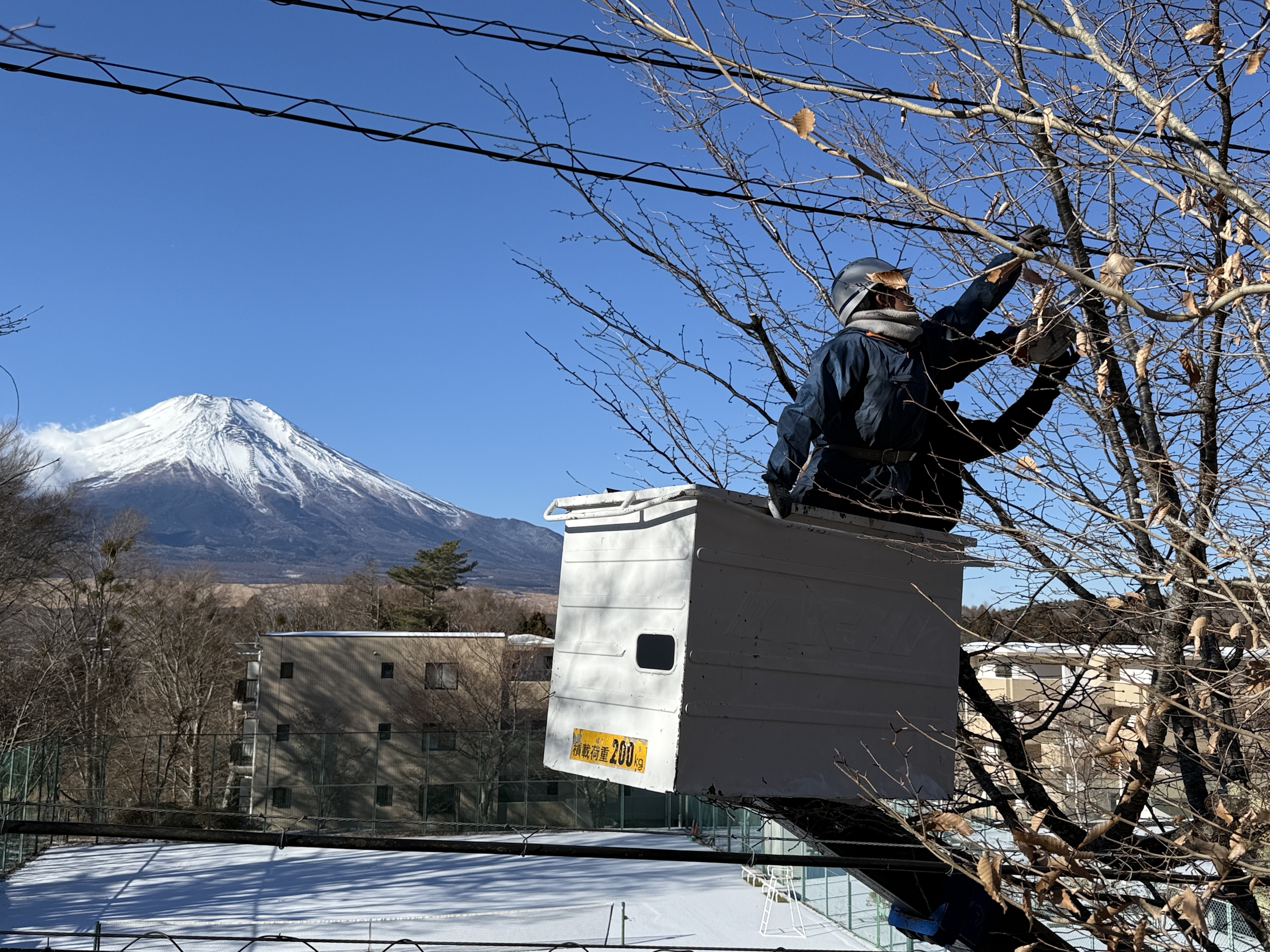 写真は山中湖 絶景の中、高木剪定をさせて頂きました。薄ら雪が舞いましたが暖かい為すぐ融けました。